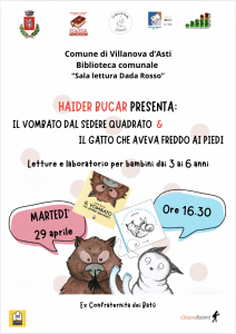 L’autrice Haider Bucar presenterà ai bambini i suoi albi illustrati “il vombato dal sedere quadrato e il gatto che aveva freddo ai piedi”, seguirà un piccolo laboratorio.
