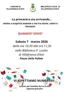 Vi aspettiamo il 7 marzo 2026 presso la Biblioteca “P. Luotto” di Villafranca d’Asti per un momento speciale dedicato alle storie, alla fantasia e alla condivisione.