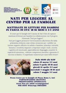 Nel nuovo Centro per le famiglie del comune di Asti, i volontari di Nati per Leggere vi aspettano per letture dedicate alla fascia 3-5 anni o 18-36 mesi (vedi locandina). A seguire laboratori a cura delle educatrici del  Centro. Per prenotazioni  3516422552